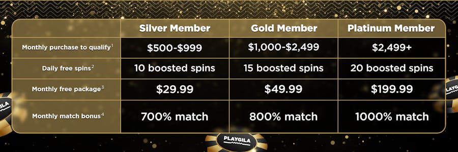 Silver Members will receive a monthly match bonus of 700%, to be used on a single purchase of $49.99 and above.
